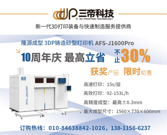 三帝科技股份有限公司成立10周年,为答谢广大用户的支持,隆源成型3DP砂型打印机AFS-J1600Pro,限时钜惠,2023年9月30日前下单,立省不止30%!预购从速!