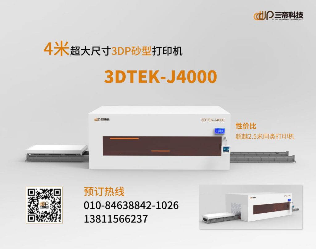 為滿足大型鑄件制造的市場(chǎng)需求,3D打印裝備及快速制造服務(wù)提供商北京三帝科技股份有限公司于國(guó)內(nèi)率先推出了自主研發(fā)的超大尺寸3DP砂型打印機(jī)3DTEK-J4000,該設(shè)備突破傳統(tǒng)加工尺寸限制,最大可成型4米的砂型。設(shè)備創(chuàng)造性地采用了無(wú)砂箱柔性區(qū)域成型技術(shù),破除了設(shè)備成型尺寸越大、設(shè)備價(jià)格狂飆的怪象,使得4米的或更大尺寸的設(shè)備,與2.5米的設(shè)備價(jià)格相差無(wú)幾成為可能。經(jīng)濟(jì)、靈活,以更低的單位成本和更短的交付時(shí)間,經(jīng)濟(jì)高效地實(shí)現(xiàn)超大尺寸的砂型制造,并可根據(jù)用戶需求按需定制擴(kuò)展打印平臺(tái),滿足10米+級(jí)的生產(chǎn)需求(6米/8米/10米設(shè)備已在同步接受預(yù)定),幫助用戶最大限度地提高生產(chǎn)力。(國(guó)外的朋友可以點(diǎn)擊這里了解我們的 large 3D printer)