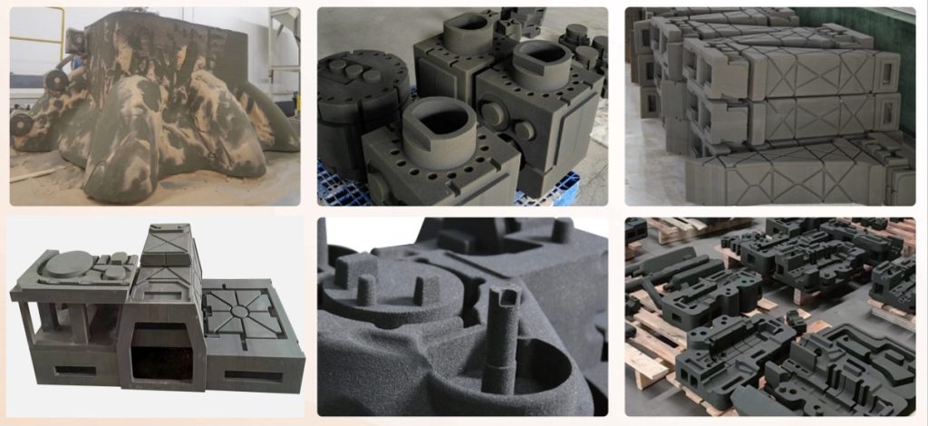 可見,大型鑄件制造在航空航天、船舶、泵閥、汽車(新能源)、能源動(dòng)力(電氣)、工業(yè)機(jī)械(機(jī)器人/無(wú)人機(jī))、軌道交通、3C電子、雕塑、教育科研、康復(fù)醫(yī)療等領(lǐng)域具有廣泛的應(yīng)用需求,而傳統(tǒng)的制造方法面臨諸多挑戰(zhàn),特別是在新產(chǎn)品的研發(fā)試制階段。例如由于鑄件尺寸巨大,通常需要拆分成部分進(jìn)行鑄造,再通過(guò)焊接集成,這不僅增加了設(shè)計(jì)負(fù)擔(dān)、時(shí)間和成本,還容易導(dǎo)致焊接缺陷,影響產(chǎn)品質(zhì)量和一致性。同時(shí),修改模具也是個(gè)難題。