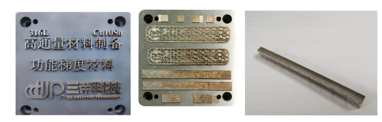 目前,公司已自主研發(fā)推出了SLM選區(qū)激光熔化金屬打印設(shè)備AFS-M120/M260、梯度金屬設(shè)備AFS-M120X(T)、多材料增減材設(shè)備AFS-M300XAS等,完成了不銹鋼/鈦合金/鋁合金/模具鋼/鈷鉻合金/鎳基合金等材料的成型及工藝開發(fā)。其中,梯度金屬打印設(shè)備AFS-M120X(T)可適用于復(fù)合金屬材料的性能研究與開發(fā),可實現(xiàn)兩種及以上多種金屬材料的連續(xù)梯度精確供粉;具備水平/垂直梯度變化方向,降低了工藝復(fù)雜性,節(jié)省粉末原材料、提升研發(fā)效率。在高通量材料制備、航空航天、汽車、醫(yī)療、模具加工等領(lǐng)域的新材料開發(fā)中具有廣闊的應(yīng)用前景。目前,三帝科技已與北京科技大學(xué)、山東理工大學(xué)、蘭州理工大學(xué)、華中科技大學(xué)、北京航空航天大學(xué)、北京鋼鐵研究總院、沈陽自動化所等眾多科研院所合作,不斷地提供先進(jìn)、可靠、實用的梯度功能金屬材料解決方案。
