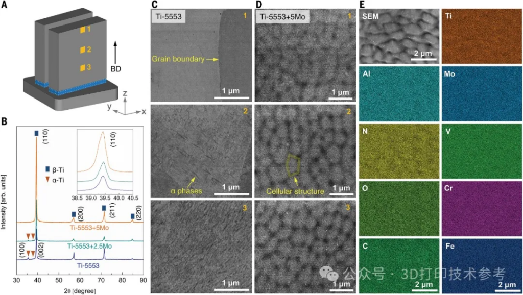 新研究帶來(lái)的重大突破研究人員此次沒(méi)有使用可能導(dǎo)致鈦合金中形成脆性金屬間共析體的β-共析穩(wěn)定劑元素,而是選擇了來(lái)自β-同晶族的Mo [包括鈮 (Nb)、鉭 (Ta) 和釩 (V)] 用于Ti-5553(Ti-5Al-5Mo-5V-3Cr)。原位合金化過(guò)程中,將鉬精確輸送到熔池中,在每層掃描期間充當(dāng)晶體形成和細(xì)化的籽晶核。Mo添加劑促進(jìn)了從大柱狀晶向細(xì)等軸和窄柱狀晶結(jié)構(gòu)的轉(zhuǎn)變。Mo還可以穩(wěn)定所需的β相并抑制熱循環(huán)過(guò)程中相異質(zhì)性的形成。