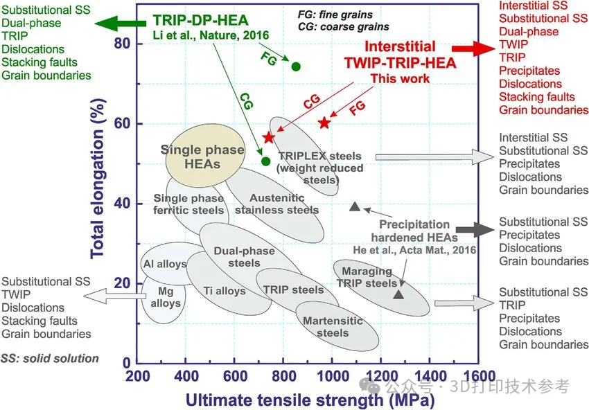 提高3D打印合金強(qiáng)度和延展性的策略有多種。其中包括優(yōu)化合金設(shè)計(jì)、工藝控制、細(xì)晶界強(qiáng)化和晶粒微觀結(jié)構(gòu)改性,還包括抑制不需要的(脆性)相、引入第二相以及進(jìn)行后處理。目前,解決柱狀晶體和不良相問(wèn)題的研究集中在原位摻入元素來(lái)改變微觀結(jié)構(gòu)和相組成。這種方法還促進(jìn)了等軸晶體的形成,即沿縱軸和橫軸晶粒尺寸大致相等的結(jié)構(gòu)。原位合金化為克服強(qiáng)度和延展性之間的平衡為題提供了一條有前途的途徑,特別是在粉末床熔融和定向能量沉積等3D打印技術(shù)中。